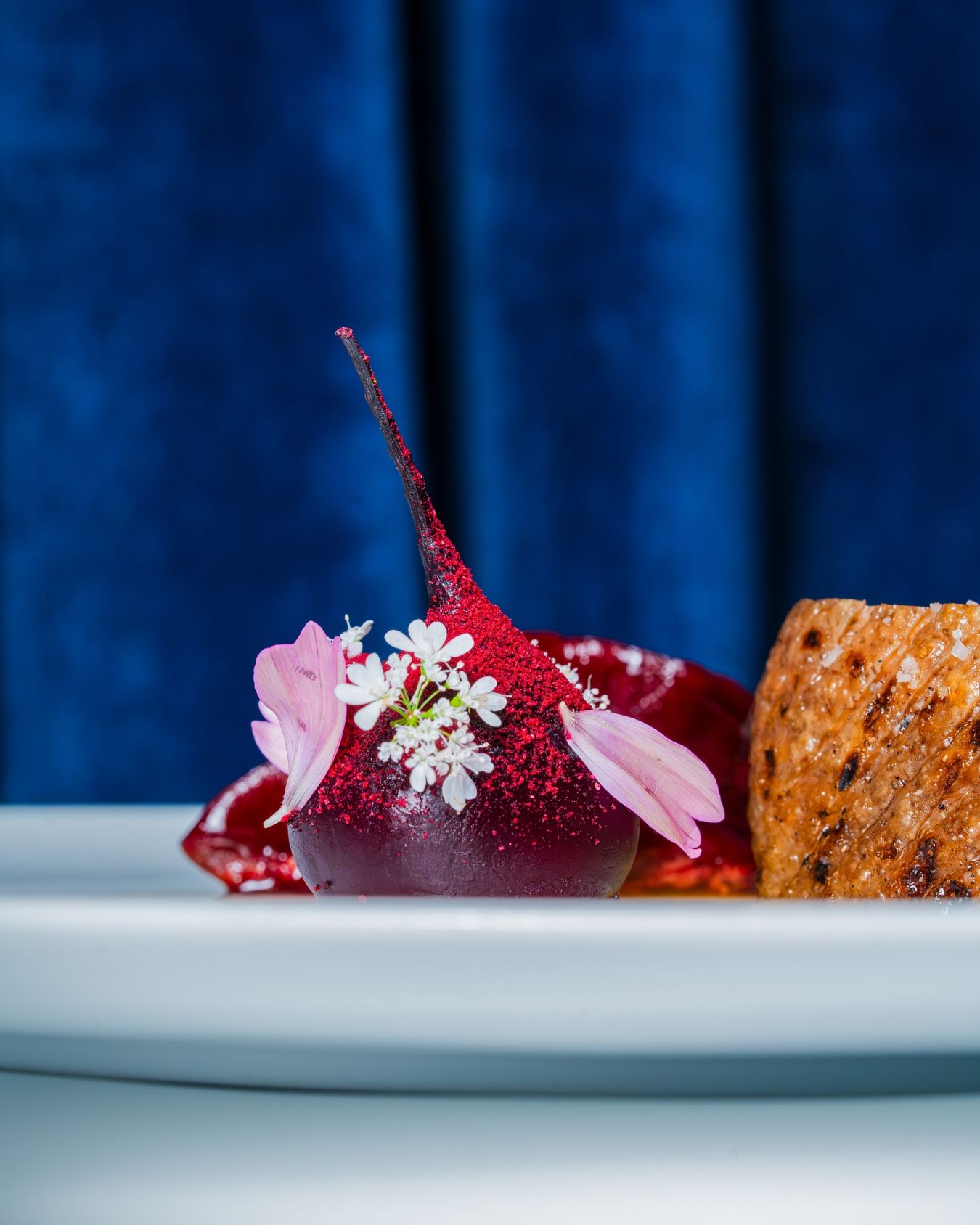 🥩 Plat — Bœuf Simmental, ravioles d’effiloché confit et oignons fumés, betterave, cerise et umeboshi